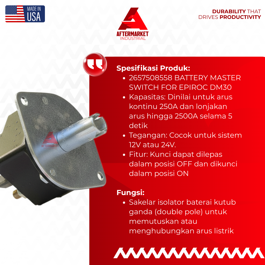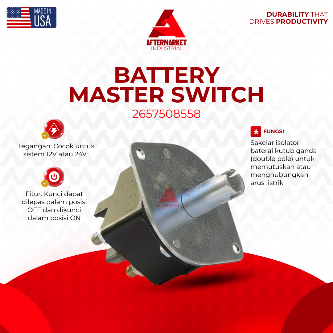 Aftermarket Industrial Indonesia mendistribusikan berbagai kebutuhan suku cadang alat berat. Ketersediaan komponen elektrikal berkualitas tentu menunjang efisiensi operasional sektor industri. Oleh karena itu, kami menyediakan Battery Master Switch 2657508558 orisinal. Suku cadang ini memberikan performa optimal untuk mesin operasional tambang. Bahkan, pengalaman kami selama dua dekade selalu menjamin kualitas unggul. Kami selalu mendukung kelancaran proyek pertambangan skala besar setiap hari.