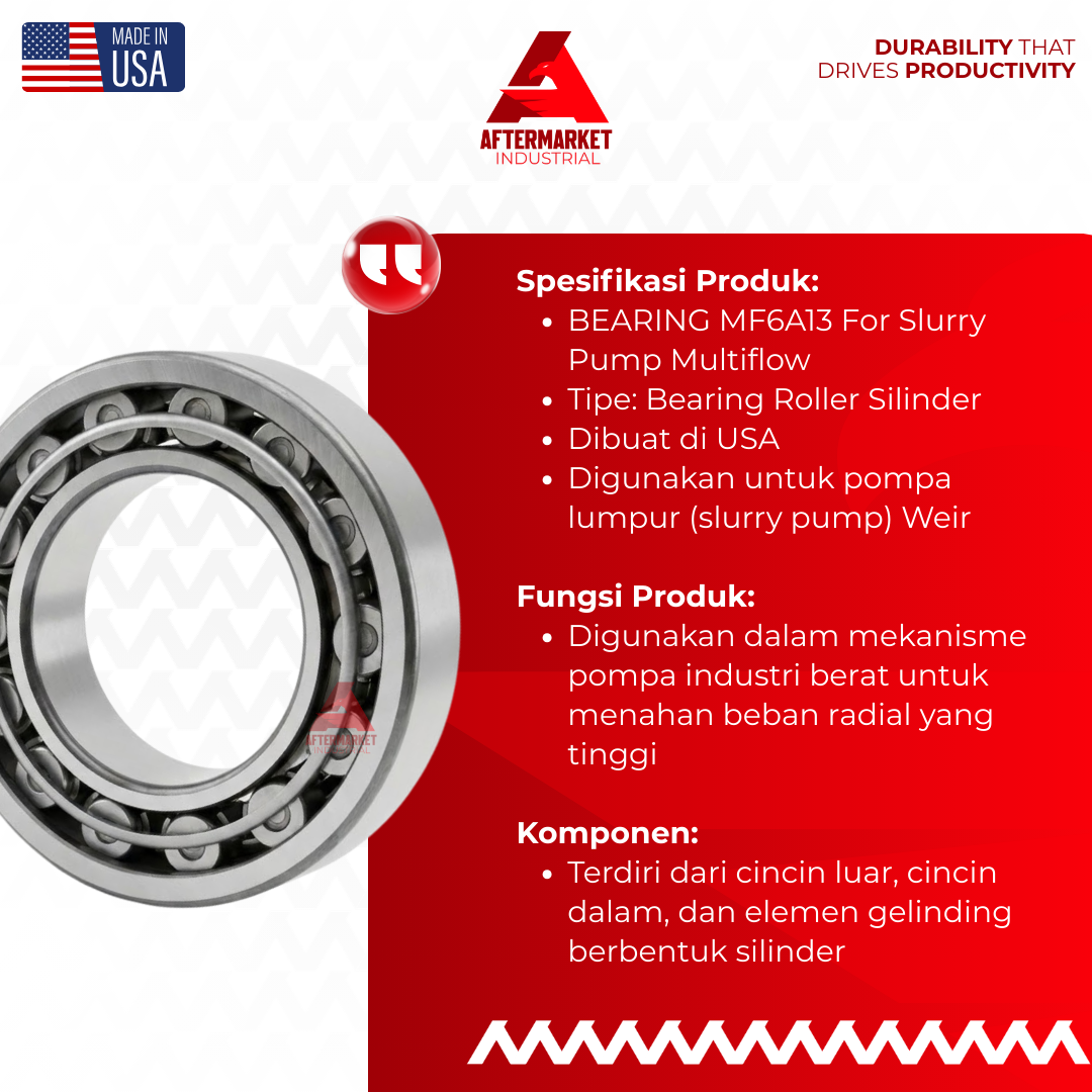 Aftermarket Industrial Indonesia mendistribusikan berbagai kebutuhan suku cadang alat berat. Ketersediaan komponen bantalan berkualitas tentu menunjang efisiensi operasional sektor industri. Oleh karena itu, kami menyediakan Bearing MF6A13 Pompa Lumpur orisinal. Suku cadang ini memberikan performa optimal untuk mesin operasional tambang. Bahkan, pengalaman kami selama dua dekade selalu menjamin kualitas unggul. Kami selalu mendukung kelancaran proyek pertambangan skala besar setiap hari.
